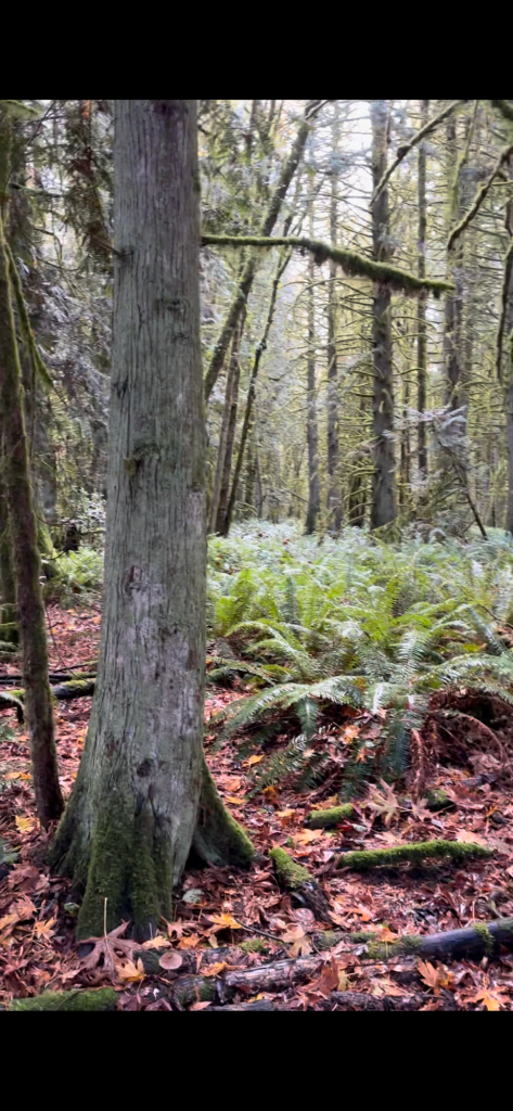 I finally get it. After my friend recommended Evergreen College’s beach trails, I made my way over and… wow. Just wow. The whole place felt like stepping into another world—a “living laboratory” as they call it, and I’m beyond thankful for the suggestion. The trails were stunning, winding through dense, mature trees with ferns (yes, I’m still questioning my plant ID skills) and a soft carpet of moss wrapping around every trunk. I’m from Utah, so I’ve never seen anything quite like it; it’s all so green, and it’s magical.